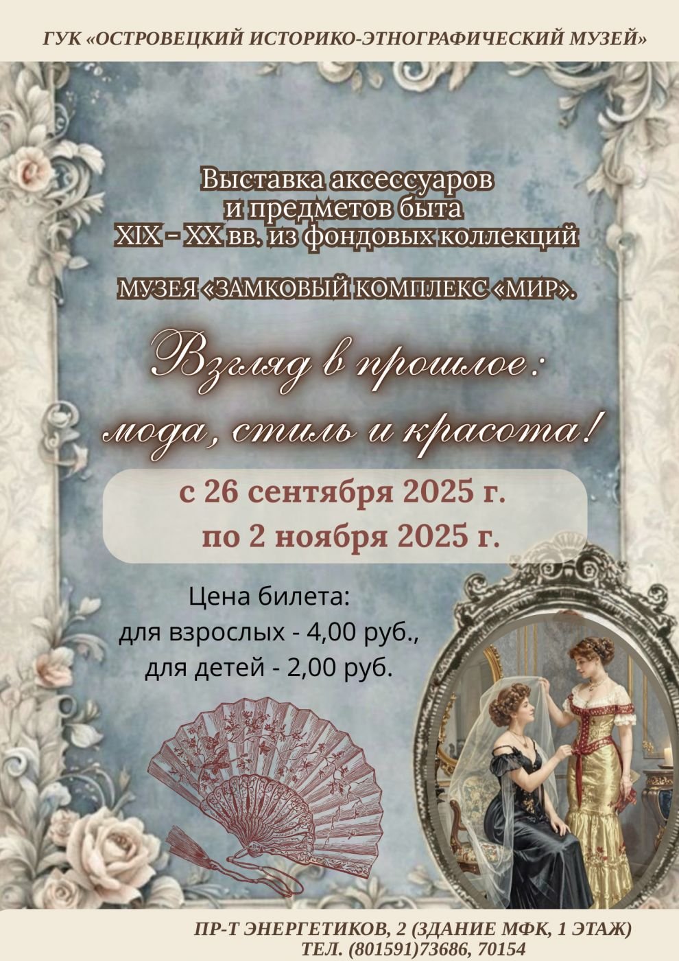Приглашаем на выставку "Взгляд в прошлое: мода, стиль и красота!", где будут размещены аксессуары и предметы быта ХІХ-ХХ вв. из фондовых коллекций музея "Замковый комплекс "МИР". Несмотря на свое название, выставка предлагает не просто взгляд в прошлое, а живое соприкосновение с культурой, где каждая деталь имела своё значение. На экспозиции представлено более 50 подлинных предметов, раскрывающих тонкости светской жизни и повседневного быта аристократии XIX – нач.XX вв.: роскошные аксессуары из бисера и кружева, дамские швейные принадлежности и туалетные наборы, мужские курительные принадлежности. Особый раздел посвящен досугу. Здесь можно увидеть изысканные веера с тайным языком жестов, миниатюрные предметы для светских визитов, аксессуары для театральных вечеров и многое другое.